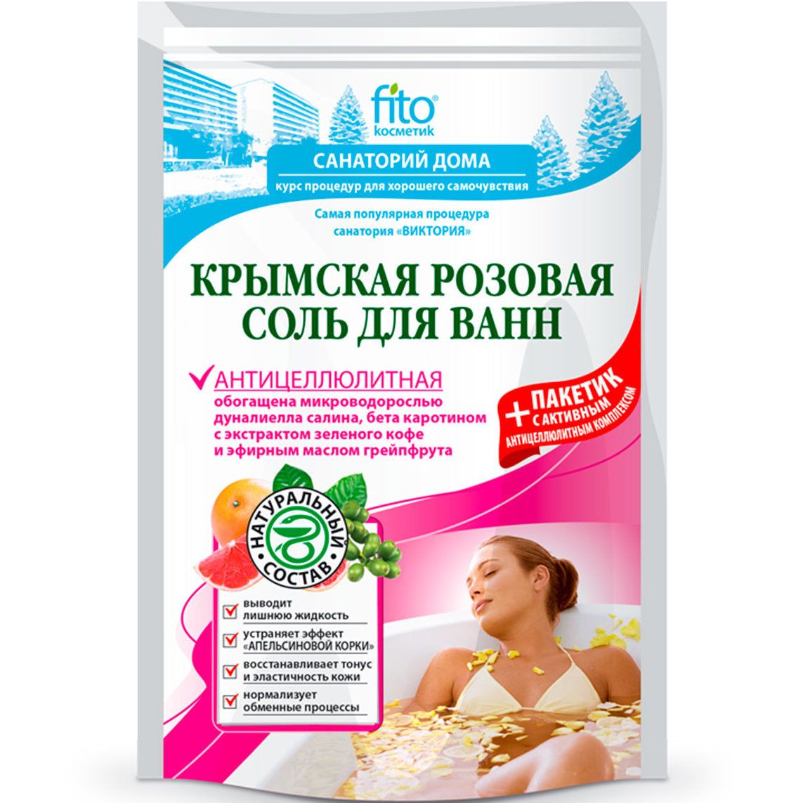Крымская розовая соль, насыщенная уникальной микроводорослью дуналиелла салина, в сочетании со специальным активным антицеллюлитным комплексом на основе зеленого кофе и эфирного масла грейпфрута буквально творит чудеса! Ускоряет обменные процессы, выводит токсины и лишнюю жидкость, активизирует кровообращение, полностью устраняет эффект «апельсиновой корки», укрепляет и подтягивает кожу. Курс из 10-12 процедур «стирает» все признаки целлюлита, Ваша кожа снова упругая, эластичная и подтянутая, как после полноценного курса санаторных процедур.Применение: Растворите всю соль из пакета в ванне с теплой водой (37 – 38 оС). Добавьте противопростудный настой из пакетика в ванну. Продолжительность принятия ванны 15 - 20 минут. Для достижения максимального эффекта принимайте курсом из 10-12 процедур через день.